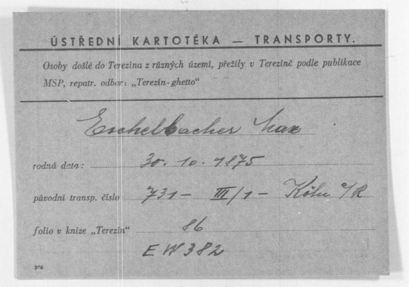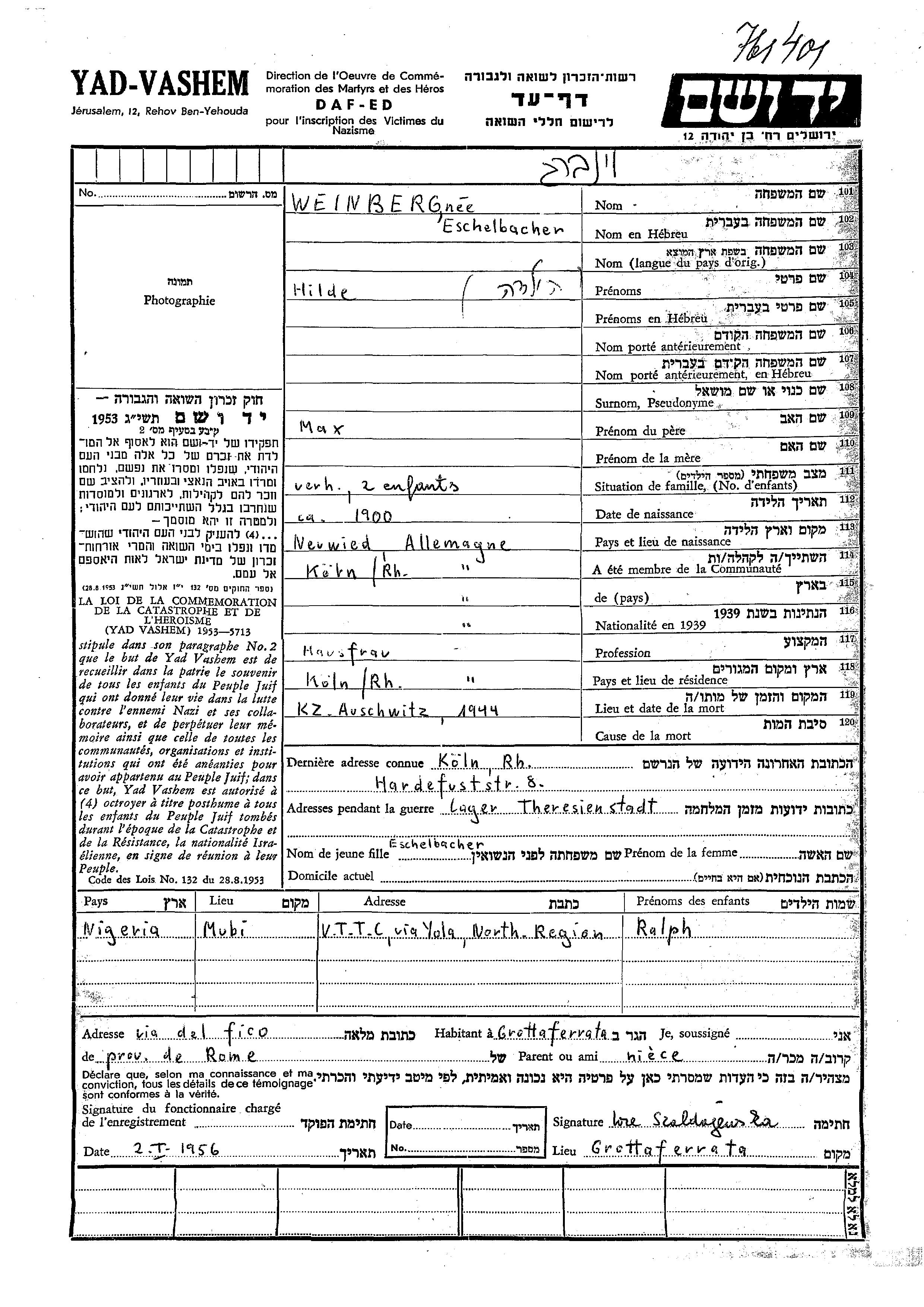 Hildes Vater, Max Eschelbacher, wurde mit dem Transport III/1 von Köln aus am 15. Juni 1942 ins Ghetto Theresienstadt deportiert,[11] überlebte dort und konnte am 5. Februar 1945 zu Verwandten in die Schweiz ausreisen,[12] wo er 1951 verstarb und auf dem jüdischen Friedhof in La Tour-de-Peilz beerdigt wurde.[13]