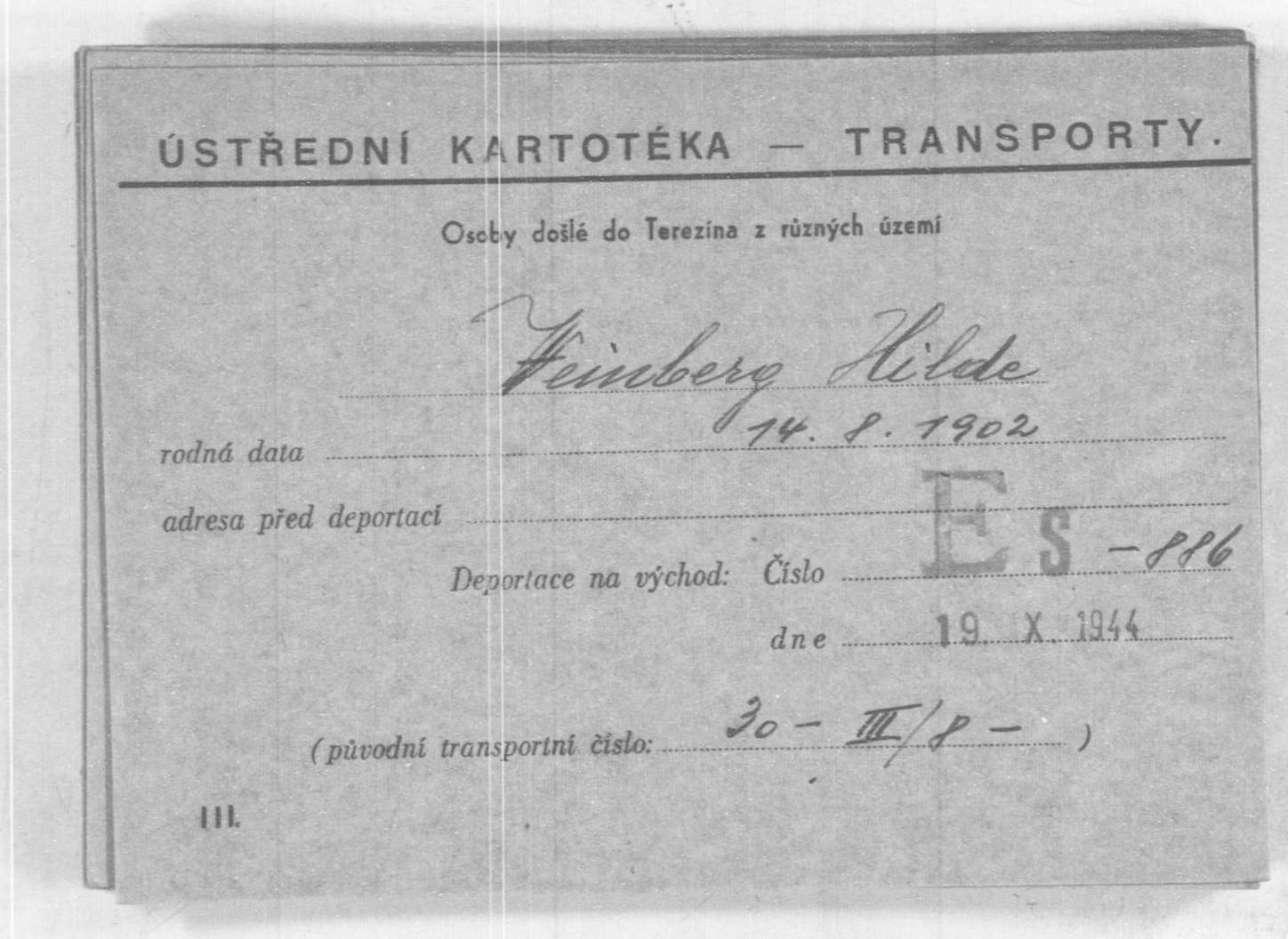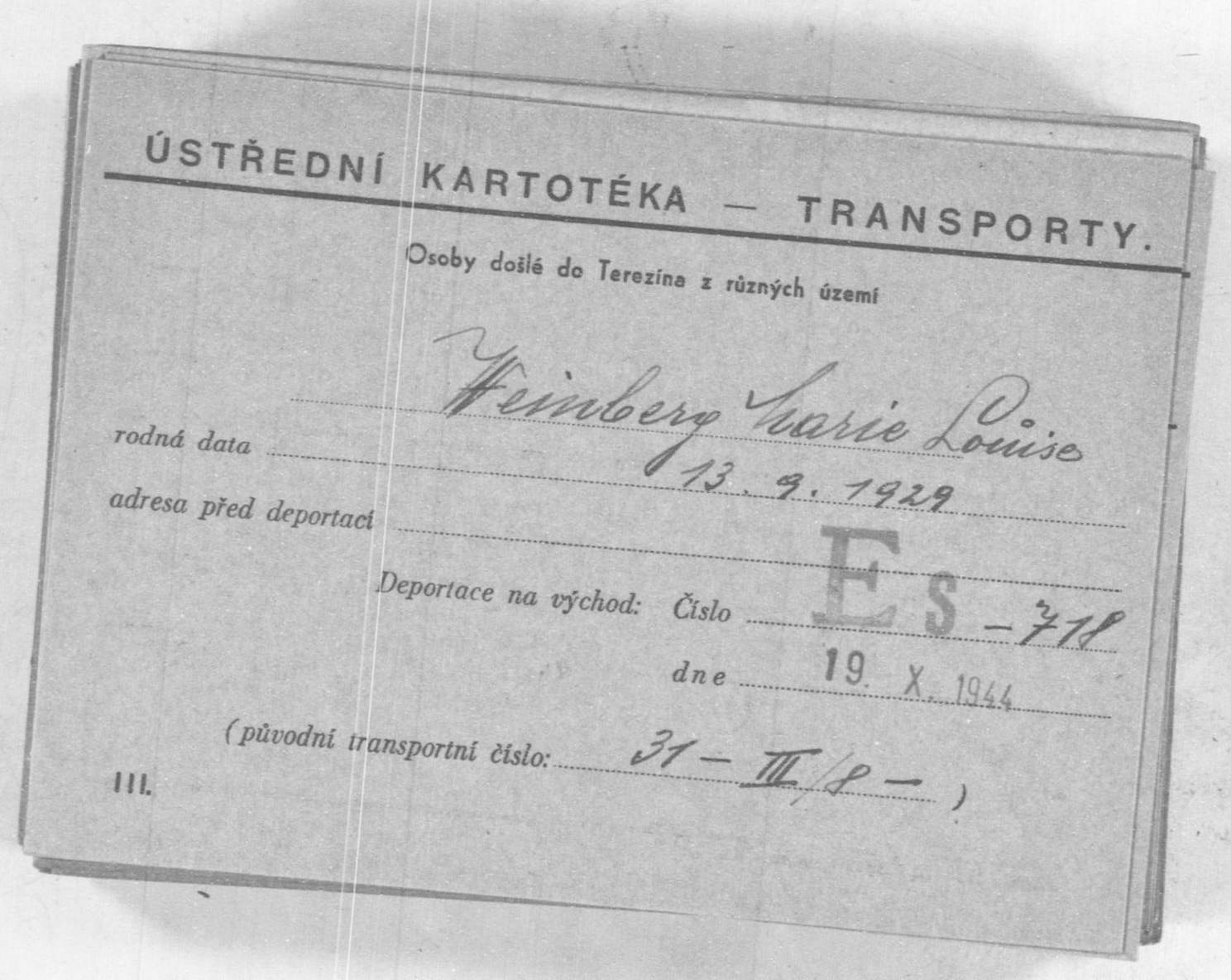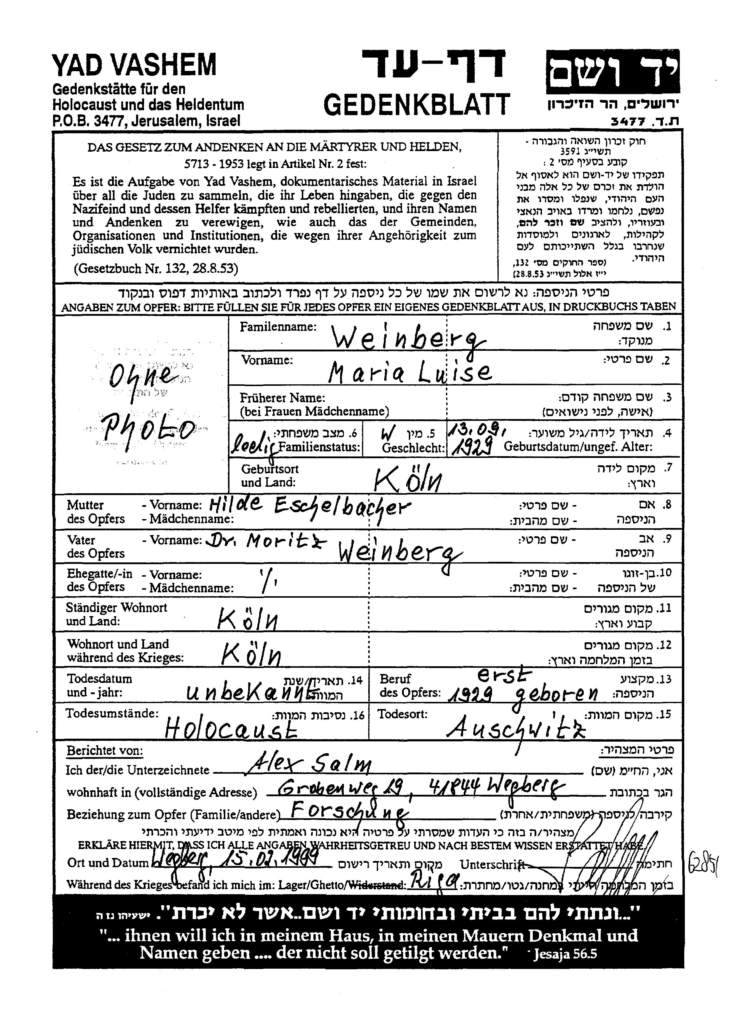 Schließlich wurde das Ehepaar Weinberg zusammen mit seiner Tochter am 19. Juni 1943 mit dem Transport III/8 (Personentransportnummern 29–31) von Köln aus deportiert. Dank Weinbergs geleisteten Kriegswehrdienst und vor allem seinen Auszeichnungen aus dem Ersten Weltkrieg geschah dies zunächst nicht nach Auschwitz oder in ein anderes Vernichtungslager im damals besetzten Polen, sondern sie kamen ins Ghetto Theresienstadt.[35][36][37] 1944 erkrankte Marie Luise und wurde in die Krankenstation verlegt. Etwa Mitte Oktober erhielt die Lagerleitung den Befehl, alle dort noch befindlichen Patienten in das KZ Auschwitz zu überstellen.[38] Am 19. Oktober 1944 wurde daher Marie Luise begleitet von ihren Eltern (Personentransportnummern 650, 886 und 718) nach Auschwitz verbracht und dort ermordet.[39][40][41]