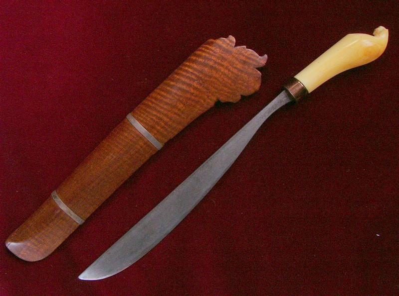 - Einschneidig und vom Heft zum Ort etwas breiter werdend. Die Klinge ist leicht s-förmig und im vorderen Bereich bauchig. Insgesamt ist die Klinge wesentlich schmaler als bei der ersten Variante. Das Heft besteht aus Holz oder Horn und ist zur Schneidenseite gebogen. Der Knauf ist mit Schnitzereien verziert.